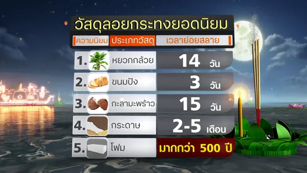 ข้อมูลจากหลายแหล่งระบุว่า วัสดุที่นิยมใช้ในการทำกระทงในปัจจุบันส่วนใหญ่เป็นวัสดุที่ย่อยสลายได้ตามธรรมชาติ อันดับ 1 ได้แก่ หยวกกล้วย ใช้เวลาย่อยสลายประมาณ 14 วัน รองลงมาคือ ขนมปัง ซึ่งย่อยสลายได้ภายใน 3 วัน และยังเป็นอาหารของปลาได้ด้วย อันดับ 3 คือ กะลามะพร้าว ใช้เวลาย่อยสลายราว 15 วัน ส่วน กระดาษ ใช้เวลาประมาณ 2–5 เดือน ขณะที่ โฟม ซึ่งเคยได้รับความนิยมในอดีต กลับต้องใช้เวลาย่อยสลายนานกว่า 500 ปี จึงกลายเป็นวัสดุที่ควรหลีกเลี่ยงอย่างยิ่ง เพราะก่อให้เกิดมลพิษและปัญหาขยะในแหล่งน้ำระยะยาว
