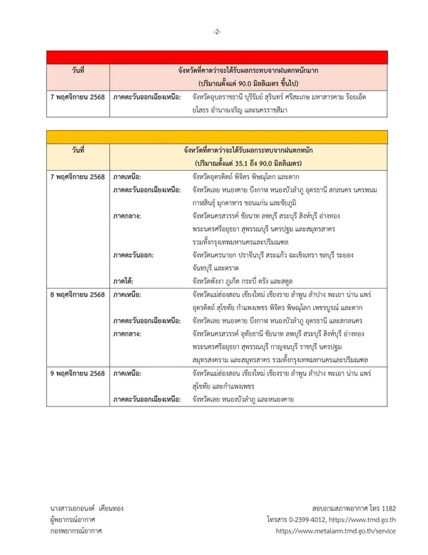 จากอิทธิพลของพายุ “คัลแมกี” ส่งผลให้ในช่วงวันที่ 7–9 พ.ย. 68 ประเทศไทยตอนบนมีฝนเพิ่มขึ้น และมีฝนตกหนัก ถึงหนักมากบางพื้นที่ โดยจะเริ่มจากบริเวณภาคตะวันออกเฉียงเหนือ ภาคตะวันออก ภาคกลาง และภาคเหนือตามลำดับ ขอให้ประชาชนในบริเวณดังกล่าวระวังอันตรายจากฝนตกหนักถึงหนักมาก และฝนที่ตกสะสม
