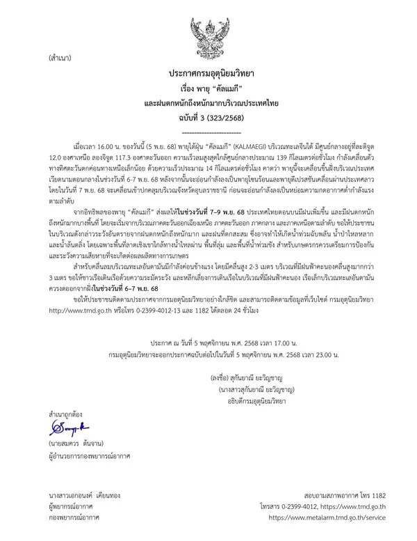 กรมอุตุนิยมวิทยา ประกาศ เรื่อง พายุ “คัลแมกี” และฝนตกหนักถึงหนักมากบริเวณประเทศไทย ฉบับที่ 3