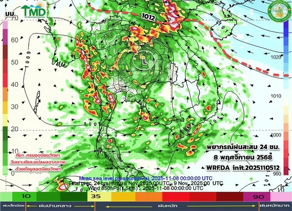 อนึ่ง พายุไต้ฝุ่น “คัลแมกี” บริเวณทะเลจีนใต้ตอนกลาง คาดว่าจะเคลื่อนขึ้นฝั่งประเทศเวียดนามตอนกลางในช่วงวันที่ 6 – 7 พ.ย. จากนั้นมีแนวโน้มจะอ่อนกำลังลงเป็นพายุโซนร้อน และในวันที่ 7 พ.ย. 68 พายุนี้จะอ่อนกำลังลงเป็นพายุดีเปรสชันปกคลุมบริเวณจังหวัดอุบลราชธานี หลังจากนั้นจะอ่อนกำลังลงเป็นหย่อมความกดอากาศต่ำกำลังแรงตามลำดับ