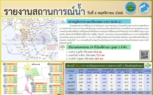- พยากรณ์อากาศวันนี้ 6 พฤศจิกายน 2568 ภาคใต้รับมือฝนตกหนัก “พายุคัลแมกี" จ่อเข้าอุบลฯ