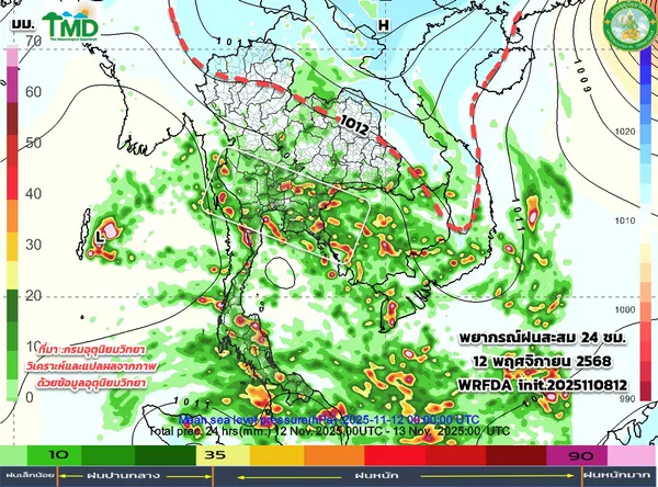 ช่วงวันที่ 13-18 พ.ย.68 มวลอากาศเย็นจากประเทศจีนกำลังปานกลาง ถึงค่อข้างแรง (สีฟ้าๆ ถึงน้ำเงิน) จะเริ่มแผ่ลงมาปกคลุมประเทศไทยตอนบน อย่างต่อเนื่อง ลมแรงขึ้น ทำให้ฝนน้อยลง อากาศเริ่มเย็นลง บางช่วงอาจจะมีฝนเล็กน้อย ระวังรักษาสุขภาพช่วงที่อากาศเปลี่ยนแปลง เตรียมรับลมหนาวและวางแผนท่องเที่ยวได้ในระยะนี้ในพื้นที่ภาคเหนือ ภาคอีสานตอนบน และเมื่อลมหนาวแรงขึ้น ประกอบกับอาจมีหย่อมความกดอากาศต่ำ เคลื่อนผ่านภาคใต้ จะทำให้ภาคใต้โดยเฉพาะฝั่งอ่าวไทยมีฝนเพิ่มขึ้น มีฝนตกหนักถึงหนักมาก ต้องเฝ้าระวัง และติดตามพยากรณ์อากาศอย่าง