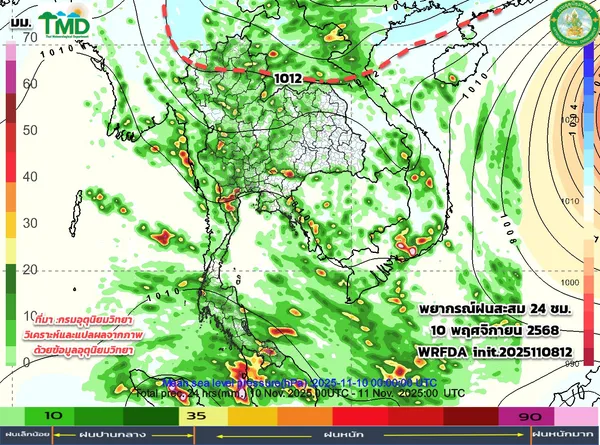 และช่วงวันที่ 10 -12 พ.ย.68 มวลอากาศเย็นเริ่มแผ่มาปกคลุมประเทศไทยตอนบน เป็นระบบมากขึ้น จะมีฝนเกิดขึ้นในช่วงแรกๆที่มวลอากาศเย็นเริ่มแผ่ลงมา หลังจากนั้นอากาศจะเริ่มเย็นในตอนเช้า ฝนลดลง ยังมีฝนเล็กน้อยบางแห่งในภาคกลางตอนล่าง ภาคตะวันออก กทม.และปริมณฑล