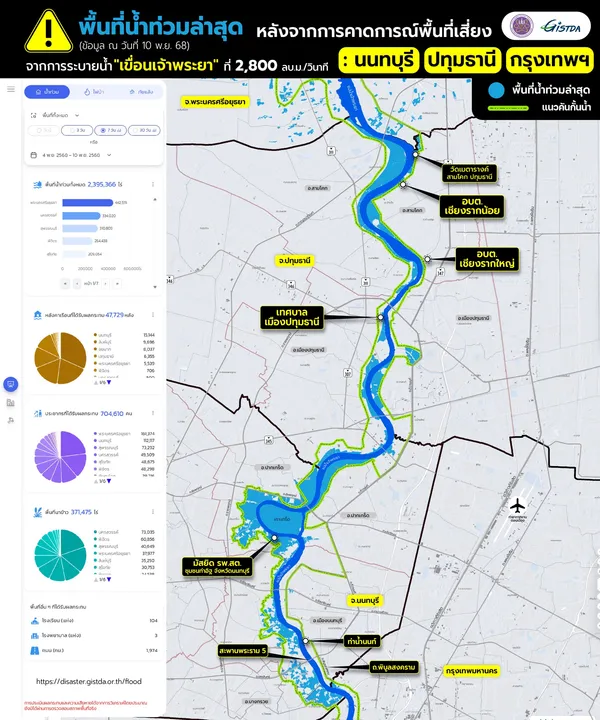 - GISTDA เตือน 3 จังหวัด ปทุมธานี นนทบุรี กรุงเทพฯ เสี่ยงน้ำท่วมจากการระบายน้ำ "เขื่อนเจ้าพระยา"