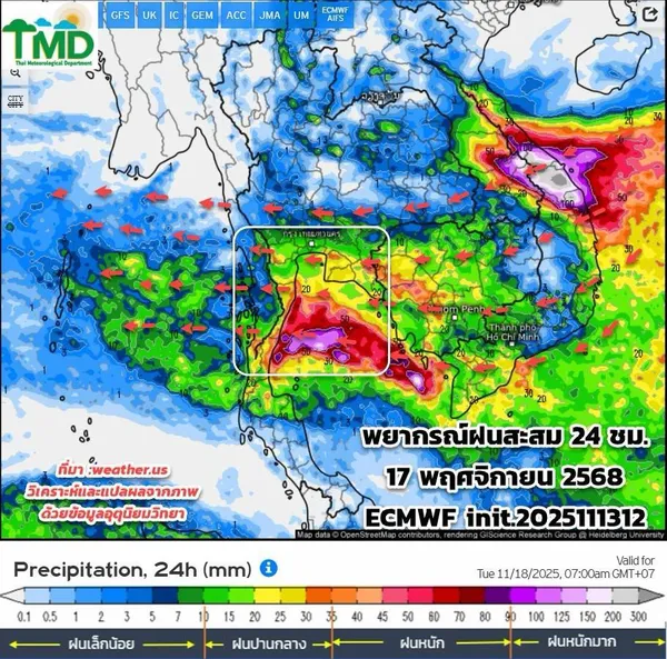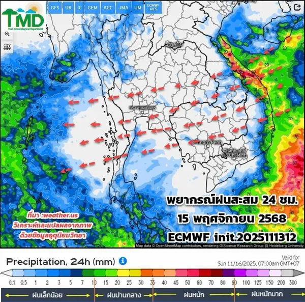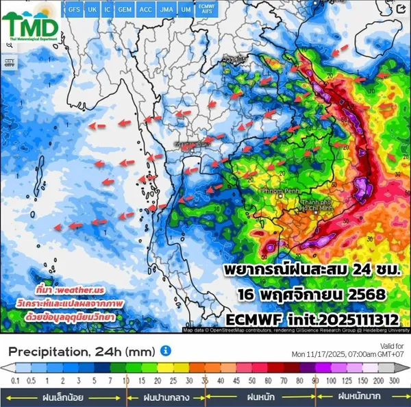 ในช่วงวันที่ 16 – 18 พ.ย. ประชาชนบริเวณประเทศไทยตอนบน ระวังอันตรายจากฝนฟ้าคะนอง และลมกระโชกแรง ส่วนในช่วงวันที่ 17 – 19 พ.ย. ประชาชนบริเวณภาคใต้ระวังอันตรายจากฝนตกหนักถึงหนักมากและฝนที่ตกสะสมไว้ด้วย ซึ่งอาจทำให้เกิดน้ำท่วมฉับพลัน น้ำป่าไหลหลาก และน้ำล้นตลิ่ง โดยเฉพาะพื้นที่ลาดเชิงเขาใกล้ทางน้ำไหลผ่าน พื้นที่ลุ่ม และพื้นที่น้ำท่วมขัง