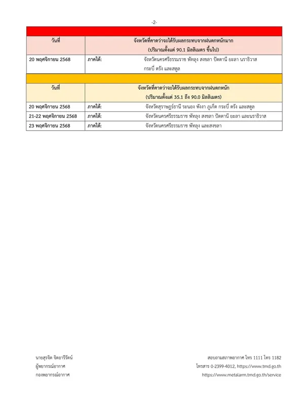 กรมอุตุนิยมวิทยา ประกาศเรื่อง อากาศหนาวเย็นบริเวณประเทศไทยตอนบน ฝนตกหนักถึงหนักมากบริเวณภาคใต้ และคลื่นลมแรงบริเวณอ่าวไทย (มีผลกระทบจนถึงวันที่ 23 พฤศจิกายน 2568) ฉบับที่ 11