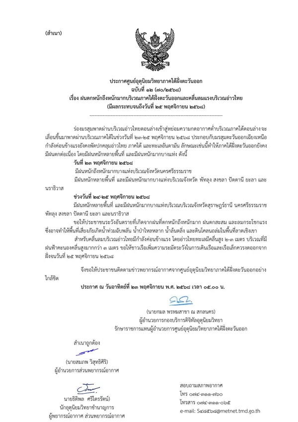 ประกาศ ศูนย์อุตุนิยมวิทยาภาคใต้ฝั่งตะวันออก ฉบับที่ 12 เรื่อง เรื่อง ฝนตกหนักถึงหนักมากบริเวณภาคใต้ฝั่งตะวันออกและคลื่นลมแรงบริเวณอ่าวไทย (มีผลกระทบจนถึงวันที่ 25 พฤศจิกายน 2568)