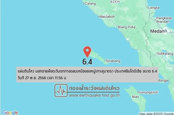วันที่ 27 พ.ย. 68 กองเฝ้าระวังแผ่นดินไหว กรมอุตุนิยมวิทยา รายงานว่า เมื่อเวลา 11.56 น. เกิดแผ่นดินไหว จุดศูนย์กลางอยู่บริเวณ นอกชายฝั่งตะวันตกทางตอนเหนือของหมู่เกาะสุมาตรา ประเทศอินโดนีเซีย ที่ละติจูด 2.585 องศาเหนือ ลองจิจูด 95.697 องศาตะวันออก ขนาด 6.4 ความลึก 10 กิโลเมตร