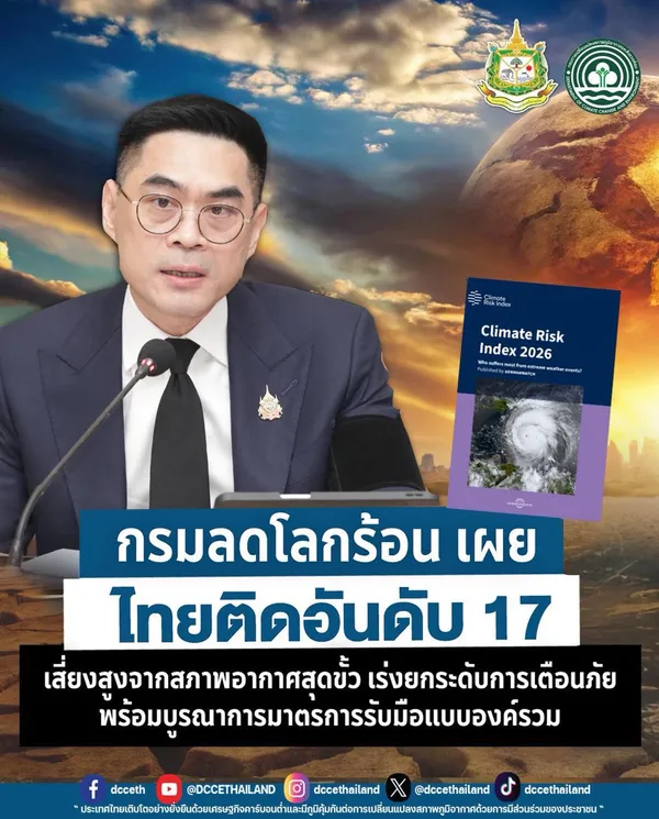 ดร.พิรุณ สัยยะสิทธิ์พานิช อธิบดีกรมการเปลี่ยนแปลงสภาพภูมิอากาศและสิ่งแวดล้อม ได้เปิดเผย ข้อมูลจากรายงาน Climate Risk Index (CRI) 2026 โดยองค์กร Germanwatch ที่ประเมินผลกระทบจากเหตุการณ์สภาพอากาศสุดขั้วทั่วโลก โดยใช้ฐานข้อมูลระหว่างประเทศ ช่วงระยะเวลา 30 ปี (ค.ศ. 1995–2024) พบว่า ในปี 2024 ประเทศไทยมีความเสี่ยงเพิ่มขึ้น อยู่ในอันดับที่ 17 จากอันดับที่ 72 ในปี 2022 สะท้อนถึงความเปราะบางต่อเหตุการณ์สภาพอากาศสุดขั้วอย่างชัดเจน ส่วนความเสี่ยงระยะยาว 30 ปี อยู่อันดับที่ 22 จากอันดับที่ 30 ในปี 2022 แสดงให้เห็นว่าความเสี่ยงของไทยเพิ่มสูงขึ้น