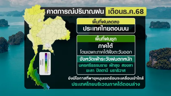 ขณะที่ ภาคใต้ ยังคงเผชิญฝนชุกต่อเนื่อง โดยปริมาณฝนสะสมทั้งฝั่งอ่าวไทยและอันดามันคาดว่าจะสูงกว่าค่าปกติเล็กน้อย 5–10% โดยเฉพาะภาคใต้ฝั่งตะวันออกที่ยังต้องเฝ้าระวังฝนตกหนักเป็นพิเศษ ได้แก่ จังหวัดนครศรีธรรมราช พัทลุง สงขลา ปัตตานี ยะลา และนราธิวาส ด้านอุณหภูมิ มวลอากาศเย็นจากจีนจะปกคลุมประเทศไทยเกือบตลอดทั้งเดือน และมีกำลังแรงเป็นระยะ ส่งผลให้อุณหภูมิเฉลี่ยของประเทศสูงกว่าค่าปกติเล็กน้อยราว 0.5 องศาเซลเซียส พื้นที่ที่มีอากาศหนาวเย็นมากที่สุดคือภาคเหนือ โดยอุณหภูมิต่ำสุดเฉลี่ยอยู่ที่ 17–19 องศาเซลเซียส ส่วนยอดดอย–ยอดภูมีสภาพ “หนาวถึงหนาวจัด”