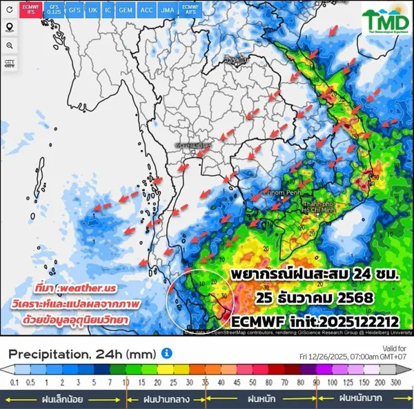 ส่วนในช่วงวันที่ 25 – 28 ธ.ค. ภาคใต้จะมีฝนเพิ่มขึ้นและมีฝนตกหนักถึงหนักมากบางแห่งทางตอนล่างของภาค เนื่องจากมรสุมตะวันออกเฉียงเหนือที่พัดปกคลุมบริเวณอ่าวไทย ภาคใต้ และทะเลอันดามัน จะมีกำลังแรงขึ้น ส่วนคลื่นลมบริเวณอ่าวไทยตอนล่างมีกำลังปานกลาง โดยมีคลื่นสูงประมาณ 2 เมตร บริเวณที่มีฝนฟ้าคะนองคลื่นสูงมากกว่า 2 เมตร อ่าวไทยตอนบนและทะเลอันดามันมีคลื่นสูง 1-2 เมตร บริเวณที่มีฝนฟ้าคะนองคลื่นสูงประมาณ 2 เมตร
