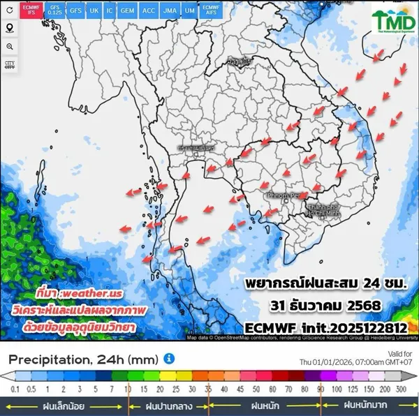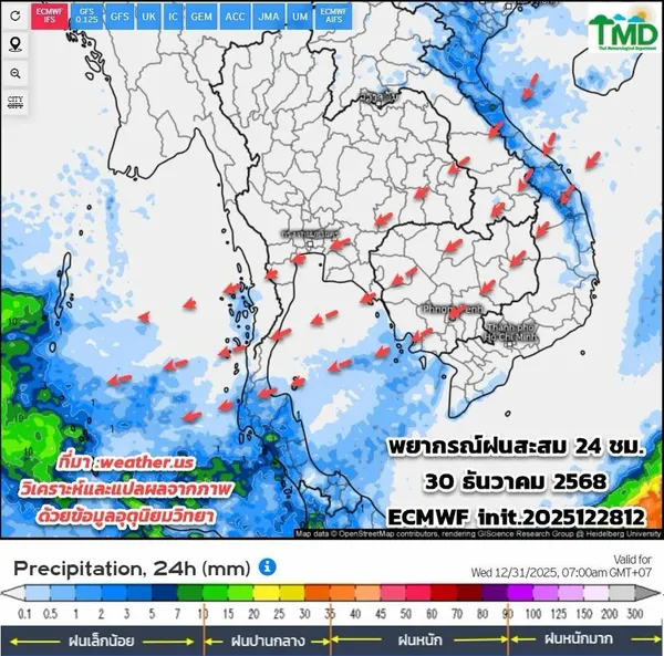 ส่วนในช่วงวันที่ 30 ธ.ค. 68 – 2 ม.ค. 69 ประเทศไทยตอนบนจะมีอุณหภูมิสูงขึ้น กับมีหมอกบางในตอนเช้า แต่ยังคงมีอากาศเย็นถึงหนาวในภาคเหนือตอนบนและภาคตะวันออกเฉียงเหนือตอนบน เนื่องจากบริเวณความกดอากาศสูงหรือมวลอากาศเย็นกำลังค่อนข้างแรงจากประเทศจีนที่ปกคลุมประเทศไทยตอนบนและทะเลจีนใต้จะมีกำลังอ่อนลง ในขณะที่ลมตะวันตกเฉียงเหนือในระดับบนยังคงพัดปกคลุมประเทศไทยตอนบน