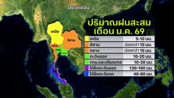 สำหรับปริมาณฝนในเดือนมกราคม กรมอุตุนิยมวิทยาคาดการณ์ว่า พื้นที่ที่จะมีฝนชุกที่สุดคือภาคใต้ฝั่งอ่าวไทย โดยจะมีฝนมากกว่าค่าปกติร้อยละ 40 จะมีปริมาณฝนสะสม 130-180 มิลลิเมตร ภาคใต้ฝั่งตะวันตก 40-80 มิลลิเมตร ส่วนประเทศไทยตอนบน เดือนนี้ฝนลดลงจากเดือนที่แล้วเยอะเลยนะ กทม.และภาคตะวันออก มีฝน 10-20 มิลลิเมตร ภาคเหนือ 5-15 มิลลิเมตร ภาคอีสาน ภาคกลาง มีฝนไม่ถึง 10 มิลลิเมตร