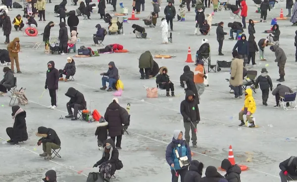 เทศกาลตกปลาน้ำแข็งประจำปีของเกาหลีใต้ ได้เริ่มต้นแล้วเมื่อวันเสาร์ (10 ม.ค.) ที่ผ่านมา จัดขึ้นในเมืองฮวาชอน ของจังหวัดกังวอน ห่างจากกรุงโซล ไปทางเหนือราว 120 กิโลเมตร ท่ามกลางสภาพอากาศที่หนาวจัดถึงลบ 9 องศาเซลเซียส ประชาชน นักท่องเที่ยว ต่างเตรียมพร้อมสวมเสื้อกันหนาวตัวหนา หมวกไหมพรม และผ้าพันคอ ต่างพากันหย่อนเบ็ดลงไปในลำธารที่กลายเป็นน้ำแข็ง และบางคนถึงกับจับปลา “ซันชอนออ” ปลาเทราต์สายพันธุ์หนึ่ง ซึ่งอาศัยอยู่ในน้ำจืด