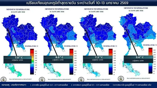 กรมอุตุนิยมวิทยา เปิดสถิติอุณหภูมิต่ำสุดบริเวณประเทศไทย เมื่อเช้าวันนี้ (13 ม.ค. 69) วัดได้ 9.4 องศาเซลเซียส ที่ อ.อุ้มผาง จ.ตาก