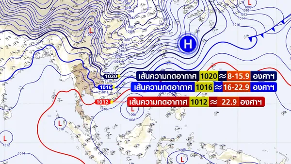 อีกหนึ่งเครื่องมือสำคัญในการประเมินสภาพอากาศ คือเส้นความกดอากาศ หรือเส้นไอโซบาร์ ซึ่งช่วยบ่งชี้ความรุนแรงของมวลอากาศเย็นที่แผ่เข้ามา โดยทั่วไป หากพบเส้นความกดอากาศ 1012 (มักแสดงเป็นเส้นสีแดง) แผ่ลงมาถึงประเทศไทย จะเริ่มรู้สึกถึงอากาศเย็น อุณหภูมิโดยเฉลี่ยอยู่ที่ประมาณ 22 องศาเซลเซียส ขณะที่เส้นความกดอากาศ 1016 บ่งชี้ว่าอุณหภูมิอาจลดลงเหลือราว 16 องศาเซลเซียสขึ้นไป