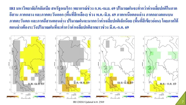 ภาพที่ 7 IRI มหาวิทยาลัยโคลัมเบีย สหรัฐอเมริกา พยากรณ์ช่วง ก.พ.-เม.ย. 69 ปริมาณฝนจะต่ำกว่าค่าเฉลี่ยปกติในภาคอีสาน ภาคกลาง และภาคตะวันออก (พื้นที่สีเหลือง) ช่วง พ.ค.-มิ.ย. 69 ภาคเหนือตอนล่าง ภาคกลางตอนบน ภาคตะวันตก และภาคอีสานตอนล่าง ปริมาณฝนจะมากกว่าค่าเฉลี่ยปกติเล็กน้อย (พื้นที่สีเขียวอ่อน) โดยภาคใต้ตอนล่างต้องระวังปริมาณฝนที่จะต่ำกว่าค่าเฉลี่ยปกติลากยาวช่วง มี.ค.-ก.ค. 69