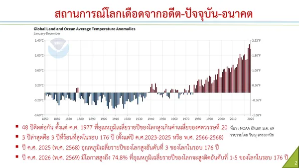 ภาพที่ 2 ศูนย์ข้อมูลสิ่งแวดล้อมแห่งชาติขององค์การบริหารมหาสมุทรและชั้นบรรยากาศแห่งชาติ (NOAA) สรุปว่า 1) 48 ปีติดต่อกัน ตั้งแต่ ค.ศ. 1977 ที่อุณหภูมิเฉลี่ยรายปีของโลกสูงเกินค่าเฉลี่ยของศตวรรษที่ 20; 2) 3 ปีล่าสุดคือ 3 ปีที่ร้อนที่สุดในรอบ 176 ปี (ตั้งแต่ปี ค.ศ.2023-2025 หรือ พ.ศ. 2566-2568); 3) ปี ค.ศ. 2025 (พ.ศ. 2568) อุณหภูมิเฉลี่ยรายปีของโลกสูงอันดับที่ 3 ของโลกในรอบ 176 ปี และ 4) ปี ค.ศ. 2026 (พ.ศ. 2569) มีโอกาสสูงถึง 74.8% ที่อุณหภูมิเฉลี่ยรายปีของโลกจะสูงติดอันดับที่ 1-5 ของโลกในรอบ 176 ปี