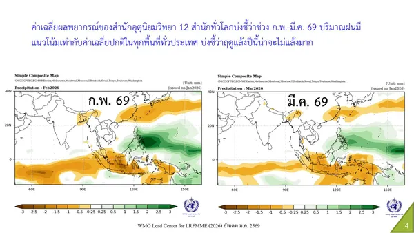ภาพที่ 4 ค่าเฉลี่ยผลพยากรณ์ของสำนักอุตุนิยมวิทยา 12 สำนักทั่วโลกบ่งชี้ว่าช่วง ก.พ.-มี.ค. 69 ปริมาณฝนมีแนวโน้มเท่ากับค่าเฉลี่ยปกติในทุกพื้นที่ทั่วประเทศ บ่งชี้ว่าฤดูแล้งปีนี้น่าจะไม่แล้งมาก