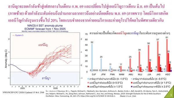 ภาพที่ 3 ศูนย์พยากรณ์อากาศระยะกลางของยุโรป (ECMWF) คาดว่าลานีญาจะลดกำลังเข้าสู่เฟสกลางในเดือน ก.พ. 69 และจะเริ่มเปลี่ยนไปสู่เอลนีโญราวเดือน มิ.ย. 69 เป็นต้นไป (ภาพซ้าย) และเข้าสู่เอลนีโญแบบเต็มรูปแบบราว ต.ค.-พ.ย. 69 ด้วยกำลังระดับอ่อนถึงปานกลาง (ภาพขวา) โดยมีโอกาสเกิดเอลนีโญกำลังรุนแรงขึ้นไป 20% ทั้งนี้แบบจำลองจากค่ายอเมริกา (NOAA) และค่ายยุโรป (ECMWF) ให้ผลในทิศทางเดียวกัน