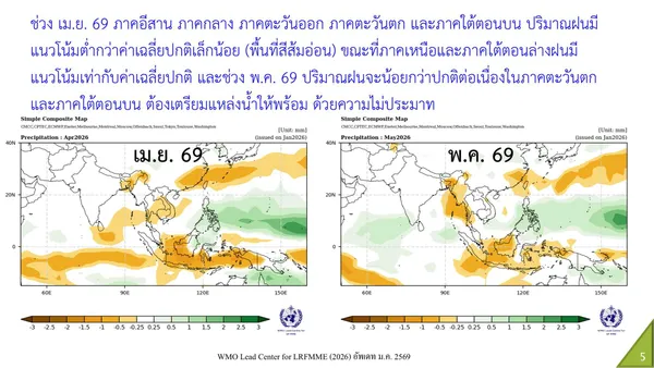 ภาพที่ 5 ช่วง เม.ย. 69 ภาคอีสาน ภาคกลาง ภาคตะวันออก ภาคตะวันตก และภาคใต้ตอนบน ปริมาณฝนมีแนวโน้มต่ำกว่าค่าเฉลี่ยปกติเล็กน้อย (พื้นที่สีส้มอ่อน) ขณะที่ภาคเหนือและภาคใต้ตอนล่างฝนมีแนวโน้มเท่ากับค่าเฉลี่ยปกติ และช่วง พ.ค. 69 ปริมาณฝนจะน้อยกว่าปกติต่อเนื่องในภาคตะวันตก และภาคใต้ตอนบน ต้องเตรียมแหล่งน้ำให้พร้อม ด้วยความไม่ประมาท