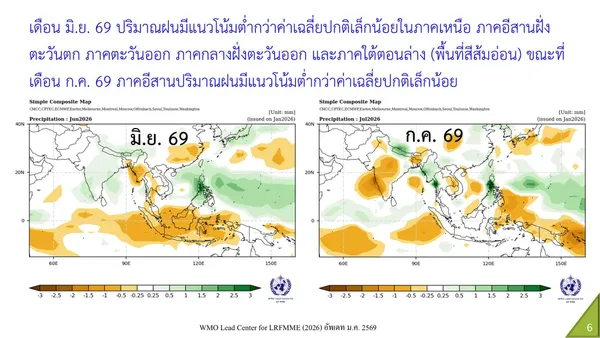 ภาพที่ 6 เดือน มิ.ย. 69 ปริมาณฝนมีแนวโน้มต่ำกว่าค่าเฉลี่ยปกติเล็กน้อยในภาคเหนือ ภาคอีสานฝั่งตะวันตก ภาคตะวันออก ภาคกลางฝั่งตะวันออก และภาคใต้ตอนล่าง (พื้นที่สีส้มอ่อน) ขณะที่เดือน ก.ค. 69 ภาคอีสานปริมาณฝนมีแนวโน้มต่ำกว่าค่าเฉลี่ยปกติเล็กน้อย