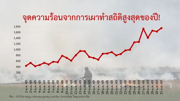 โดยข้อมูลจุดความร้อนที่รายงานโดย GISDTA พบว่า มีจุดความร้อนพุ่งสูงจากเมื่อวานจาก 1,634 จุด เพิ่มขึ้นเป็น 1,754 จุด ทำสถิติสูงสุดใหม่ของปีนี้ การเผาในนาข้าวยังครองแชมป์สูงถึง 632 รองลงมาได้แก่ อ้อย 217 จุด (เพิ่มขึ้นอย่างมาก) ตามมาด้วย ข้าวโพดและไร่หมุนเวียน 119 จุด (เพิ่มขึ้นอย่างมากเช่นกัน) และเกษตรอื่นๆ 299 จุด (เพิ่มขึ้นอย่างมากเช่นกัน) โดยพื้นที่ป่าเผามากขึ้นอีกเป็น 347 จุด และจุดความร้อนจากแหล่งอื่น 140 จุด