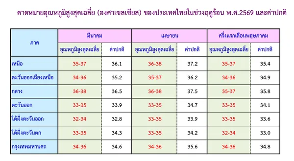 ฤดูร้อนของประเทศไทยปีนี้ คาดว่า จะเริ่มช้ากว่าปกติ (ประมาณปลายเดือนกุมภาพันธ์) ซึ่งช้ากว่าปกติประมาณ 2 สัปดาห์ และจะสิ้นสุดประมาณกลางเดือนพฤษภาคม โดยลักษณะอากาศจะร้อนอบอ้าวเป็นระยะๆ สลับกับจะมีฝนฟ้าคะนอง หลายพื้นที่ในบางช่วง ซึ่งจะช่วยคลายความร้อนลงได้ และจะมีอากาศร้อนจัดบางพื้นที่ในบางวัน ส่วนมากช่วงเดือนเมษายนถึงเดือนพฤษภาคม โดยอุณหภูมิสูงสุดเฉลี่ยบริเวณประเทศไทยตอนบน 36 - 37 องศาเซลเซียส ซึ่งจะสูงกว่าค่าปกติ (ค่าปกติ 35.4 องศาเซลเซียส) และจะสูงกว่าปีที่ผ่านมาเล็กน้อย (ช่วงฤดูร้อนปี พ.ศ.2568 อุณหภูมิสูงสุดเฉลี่ย 35.8 องศาเซลเซียส) ส่วนปริมาณฝนรวมเฉลี่ยจะต่ำกว่าค่าปกติร้อยละ 30 - 40