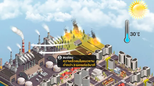 ปัจจัยที่สาม คือความเร็วลม โดยเฉพาะลมในแนวราบ หากมีความเร็วต่ำกว่า 3 เมตรต่อวินาที หรือประมาณ 10 กิโลเมตรต่อชั่วโมง จะทำให้ฝุ่นไม่สามารถกระจายตัวออกไปได้ ส่งผลให้เกิดการสะสมและเพิ่มความรุนแรงของมลพิษทางอากาศ