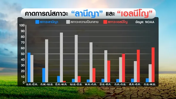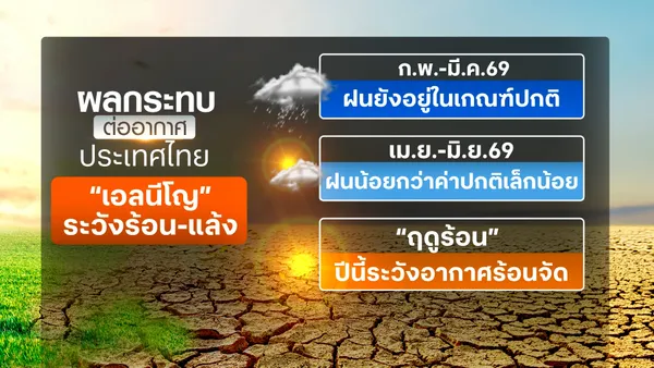 ด้านอุณหภูมิ คาดว่าทั่วประเทศจะสูงกว่าค่าเฉลี่ยต่อเนื่องตั้งแต่เดือนกุมภาพันธ์ไปจนถึงเดือนกรกฎาคม โดยภาคใต้และภาคตะวันออกมีแนวโน้มเผชิญอากาศร้อนจัดมากกว่าพื้นที่อื่น การเปลี่ยนผ่านจากลานีญาสู่เอลนีโญในครั้งนี้ สะท้อนถึงความผันผวนของสภาพอากาศที่อาจทวีความชัดเจนมากขึ้นในช่วงเดือนต่อจากนี้ ซึ่งจำเป็นต้องติดตามสถานการณ์อย่างใกล้ชิดและเตรียมมาตรการรับมืออย่างไม่ประมาท
