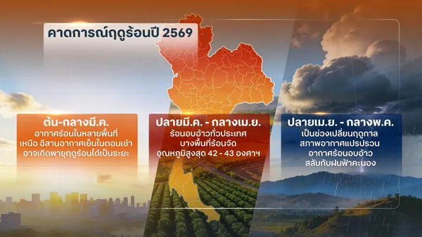 กรมอุตุนิยมวิทยาคาดการณ์ว่าฤดูร้อนของไทยปีนี้ คาดว่าจะเริ่มช้ากว่าปกติ ซึ่งช้ากว่าปกติประมาณ 2 สัปดาห์ โดยลักษณะอากาศจะร้อนอบอ้าวเป็นระยะๆ สลับกับจะมีฝนฟ้าคะนอง หลายพื้นที่ในบางช่วง ซึ่งจะช่วยคลายความร้อนลงได้ และจะมีอากาศร้อนจัดบางพื้นที่ในบางวัน โดยคาดว่าจะเริ่มต้นช่วงปลายเดือนกุมภาพันธ์ 2569 และสิ้นสุดกลางเดือนพฤษภาคม 2569