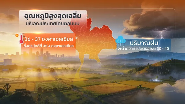 อุณหภูมิสูงสุดเฉลี่ยบริเวณประเทศไทยตอนบนอยู่ที่ 36 - 37 องศาเซลเซียส ซึ่งค่าปกติที่ 35.4 องศาเซลเซียส ขณะที่ปริมาณฝนรวมเฉลี่ยจะ ต่ำกว่าค่าปกติร้อยละ 30 - 40ขณะที่มี 3 จังหวัดในภาคเหนือ คือ ที่จังหวัดแม่ฮ่องสอน ลำปาง และตาก มีโอกาสเผชิญอุณหภูมิสูงเกิน 42 องศาเซลเซียส