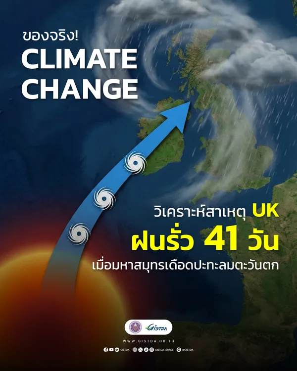 สำนักงานพัฒนาเทคโนโลยีอวกาศและภูมิสารสนเทศ (องค์การมหาชน) หรือ GISTDA ออกมาวิเคราะห์สาเหตุอังกฤษฝนตกต่อเนื่อง 41 วัน นี่ไม่ใช่เรื่องบังเอิญ