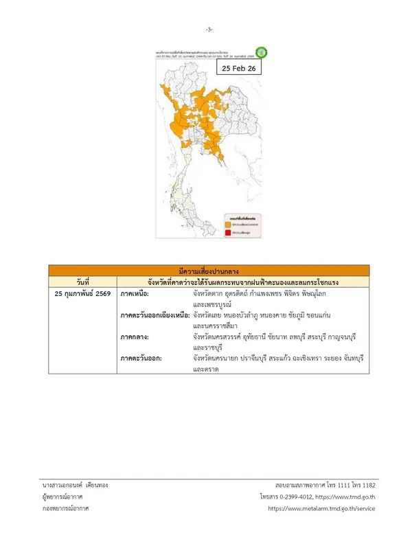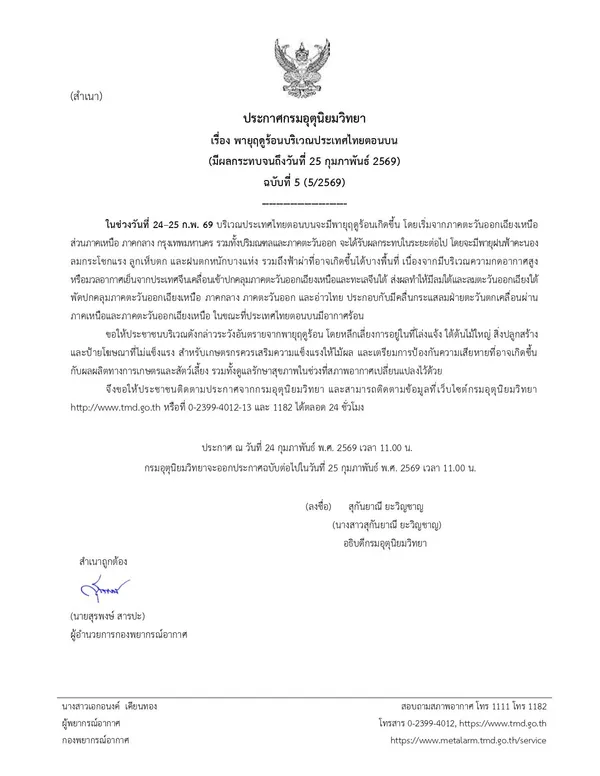 กรมอุตุนิยมวิทยา ประกาศเรื่อง พายุฤดูร้อนบริเวณประเทศไทยตอนบน(มีผลกระทบจนถึงวันที่ 25 กุมภาพันธ์ 2569)ฉบับที่ 5 (5/2569)