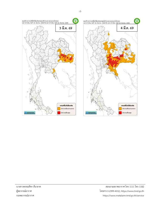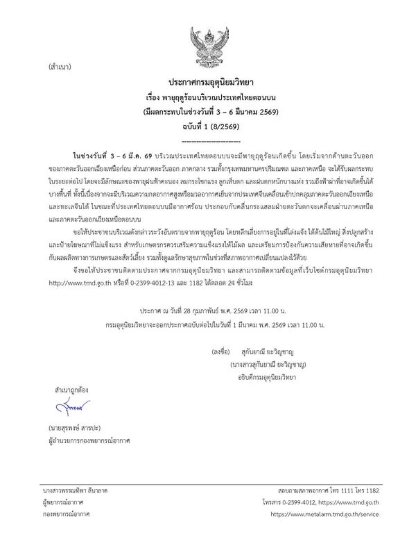 กรมอุตุนิยมวิทยา ประกาศเรื่อง พายุฤดูร้อนบริเวณประเทศไทยตอนบน (3 – 6 มีนาคม 2569) ฉบับที่1