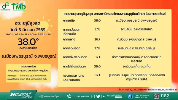 กรมอุตุนิยมวิทยา รายงานอุณหภูมิสูงสุดบริเวณประเทศไทย เมื่อวานนี้ (5 มี.ค. 69) วัดได้ 38.0 องศาเซลเซียส ที่ อ.เมืองเพชรบูรณ์ จ.เพชรบูรณ์