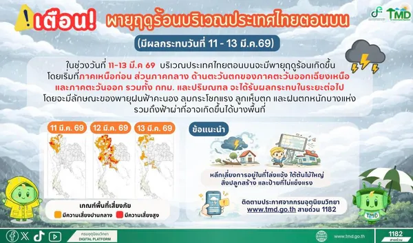 อนึ่ง ในช่วงวันที่ 11-13 มี.ค. 69 ประเทศไทยตอนบนจะมีพายุฤดูร้อนเกิดขึ้น โดยเริ่มจากภาคเหนือก่อน ส่วนภาคกลาง ด้านตะวันตกของภาคตะวันออกเฉียงเหนือ และภาคตะวันออก รวมทั้งกรุงเทพมหานครและปริมณฑลจะได้รับผลกระทบในระยะต่อไป