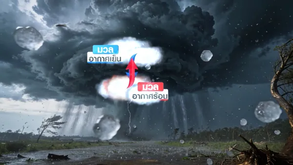 โดยเฉพาะเมื่อเริ่มต้นเข้าสู่ฤดูร้อน ช่วงนี้อากาศยังคงแปรปรวน เพราะยังมีความกดอากาศสูงหรือมวลอากาศเย็นจากจีนแผ่ลงมาบ้าง เมื่อแผ่ลงมาปะทะกับอากาศที่ร้อนจัด การที่อากาศสองกระแสมาปะทะกันส่งผลทำให้เกิดเป็น พายุฝนฟ้าคะนอง ลมกระโชกแรง ฟ้าผ่า และเกิดลูกเห็บตกได้ หรือที่เราเรียกว่า พายุฤดูร้อนนั่นเองค่ะ ลักษณะอากาศแบบนี้ ต้องหลีกเลี่ยงการอยู่ในที่โล่งแจ้ง หลีกเลี่ยงการอยู่ใต้เสาไฟฟ้า ป้ายโฆษณา หรือต้นไม้ใหญ่ เพราะสิ่งเหล่านี้อาจหักโค่นมาทับเราได้ ส่วนเกษตรกรต้องระวังผลผลิตทางการเกษตรได้รับความเสียหายด้วย