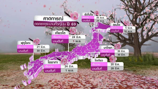 สำหรับการคาดการณ์ฤดูซากุระปีนี้ หน่วยงานด้านสภาพอากาศของญี่ปุ่นระบุว่า พื้นที่เกียวโตและโอซากาจะเริ่มมีดอกซากุระบานประมาณวันที่ 24 มีนาคม และคาดว่าจะบานเต็มที่ราววันที่ 1 เมษายน ซึ่งเร็วกว่าปีที่แล้วประมาณ 3 วัน และยังเร็วกว่าค่าเฉลี่ยในอดีต โดยปกติแล้ว ดอกซากุระในญี่ปุ่นจะเริ่มบานจากพื้นที่ทางตอนใต้ก่อน แล้วจึงค่อย ๆ ไล่ขึ้นไปทางตอนเหนือ เช่น เมืองฟุกุโอกะ คาดว่าจะเริ่มบานวันที่ 21 มีนาคม ขณะที่นาโกยาและกรุงโตเกียวคาดว่าจะเริ่มบานประมาณวันที่ 20 มีนาคม และบานเต็มที่ช่วงต้นเดือนเมษายน ส่วนพื้นที่ทางตอนเหนือของประเทศอย่างซัปโปโร คาดว่าจะเริ่มเห็นซากุระบานในช่วงปลายเดือนเมษายน โดยอาจเริ่มบานราววันที่ 26 เมษายน และบานเต็มที่ประมาณวันที่ 29 เมษายน