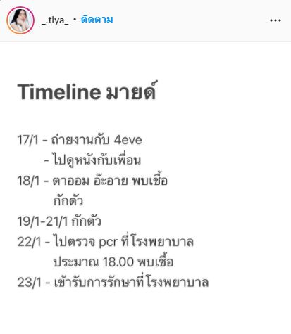 ประกาศติดเชื้อไวรัสโควิด-19 อีกราย สำหรับนักร้องดัง "มายด์ อาทิตยา" หรือ "มายด์ 4EVE" ที่ล่าสุดในอินสตาแกรมส่วนตัวนั้น ได้โพสต์ชี้แจงไทม์ไลน์ หลังทราบว่าตรวจพบเชื้อโควิด-19 โดยเธอได้เผยข้อความไว้ว่า จากการตรวจ pcr ในวันที่ 22 มกราคม ที่ผ่านมา เราได้รับผลว่าพบเชื้อค่ะ