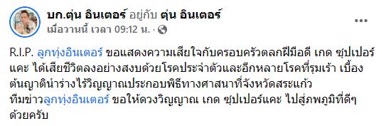 ด้าน "ตุ่น อินเตอร์" หรือ เพจ "ลูกทุ่งอินเตอร์" ก็ได้โพสต์ภาพ พร้อมกับเขียนข้อความแสดงความอาลัย ระบุว่า "R.I.P. ขอแสดงความเสียใจกับครอบครัวตลกฝีมือดี เกด ซุปเปอร์แคะ ได้เสียชีวิตลงอย่างสงบด้วยโรคประจำตัว และอีกหลายโรคที่รุมเร้า เบื้องต้นญาตินำร่างไร้วิญญาณประกอบพิธีทางศาสนาที่ จังหวัดสระแก้ว"
