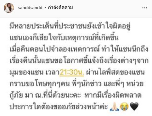 ยังไม่มีข้อสรุปที่แท้จริงสำหรับกรณีเกิดเหตุนักแสดงสาว "แตงโม นิดา" พลัดตกเรือสปีดโบ๊ท เป็นเหตุให้เสียชีวิต แม้จะมีการออกมาแถลงข่าว รวมถึงการออกมาชี้แจงข้อมูล แต่ยังไม่มีข้อสรุปใดๆ ออกมาอย่างชัดเจน อีกทั้งเมื่อวานนี้ 1 มี.ค. 3 บุคคลผู้อยู่ในเหตุการณ์คืนวันที่แตงโมพลัดตกเรือ ได้กราบขอโทษคุณแม่แตงโม และในวันเดียวกันแซนได้โพสต์ข้อความในอินสตาแกรม เตรียมแจงประเด็นที่ประชาชนยังเข้าใจผิด และขอโอกาสชี้แจงโดยการไลฟ์สด พร้อมขอโทษทุกคน