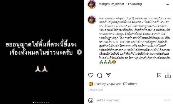 หลังจากกระแสข่าวได้ถูกตีออกไป ด้านแมงมุมได้มีการติดต่อหาอดีตผอ. ถามยอดหนี้ของคุณแม่ ซึ่งอดีตผอ. เผยว่าต้องการแค่ 6 แสนเท่านั้น กระทั่งช่วงค่ำของวันที่ 9 พฤษภาคม ด้านแมงมุม ได้เคลื่อนไหว โพสต์ยาวในอินสตาแกรมส่วนตัว ชี้แจงเรื่องราวที่เกิดขึ้นเมื่อ 3 ปีก่อน ว่า เรื่องราวเป็นคดีที่เกิดกับคุณแม่ของผม เมื่อ 20 กว่าปีที่แล้ว