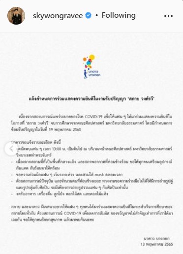 ด้าน "สกาย วงศ์รวี" ได้โพสต์ภาพเผยความหล่อในชุดครุย หลังเรียนจบคว้าปริญญา จากคณะศิลปศาสตร์ รั้วธรรมศาสตร์ วิทยาเขตท่าพระจันทร์ โดยเผยข้อความสั้นๆ ว่า "ใครสะดวกมาเจอกันได้นะครับ" พร้อมเผยกำหนดการจากต้นสังกัดที่แจ้งไว้ว่า กำหนดการซ้อมรับปริญญาในวันที่ 19 พฤษภาคม เวลา 13.00 น. เป็นต้นไป