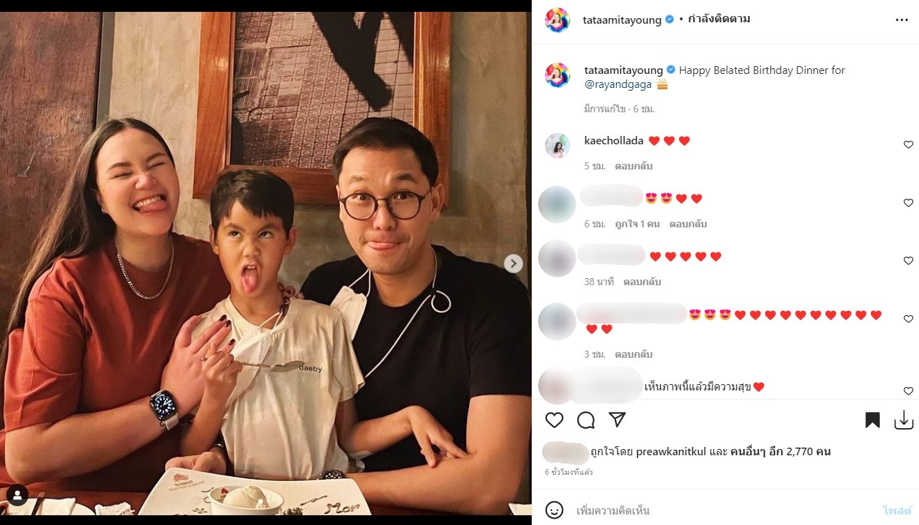 อีกทั้งล่าสุดนี้ ในอินสตาแกรมของทาทา ได้เผยภาพร่วมโต๊ะดินเนอร์ ย้อนหลังวันเกิดของอดีตสามี ซึ่งในภาพนั้นเป็นภาพครอบครัวพร้อมหน้าพร้อมตาทั้ง 3 คน ก่อนระบุข้อความไว้ว่า "Happy Belated Birthday Dinner for @rayandgaga" ท่ามกลางแฟนๆ ที่เข้ามาส่งอิโมจิรูปหัวใจ และเผยว่าเห็นภาพนี้แล้วมีความสุข และร่วมอวยพรวันเกิด คุณหมอ อดีตสามีของทาทากันอย่างเนืองแน่นเลยทีเดียว