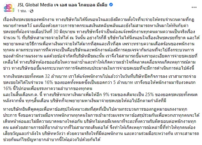 หลังบริษัท JSL ร่อนจดหมายชี้แจง เรื่องการยุติการดำเนินงานบางส่วนของบริษัท หลัง 8 ปีที่ผ่านมา ได้รับผลกระทบหนัก จึงเห็นสมควรที่จะยุติการดำเนินงานบางส่วนลง ตั้งแต่วันที่ 1 กรกฎาคม 2565 ทำให้กลายเป็นกระแสร้อนเมื่ออดีตพนักงานเข้าร้องกระทรวงแรงงาน กรณีถูกเลิกจ้างไม่เป็นธรรม ล่าสุด JSL ได้โพสต์ข้อความ ชี้แจงเรื่องเงินชดเชยของพนักงาน ว่า เรื่องเงินชดเชยของพนักงาน ทางบริษัทไม่ได้นิ่งนอนใจ