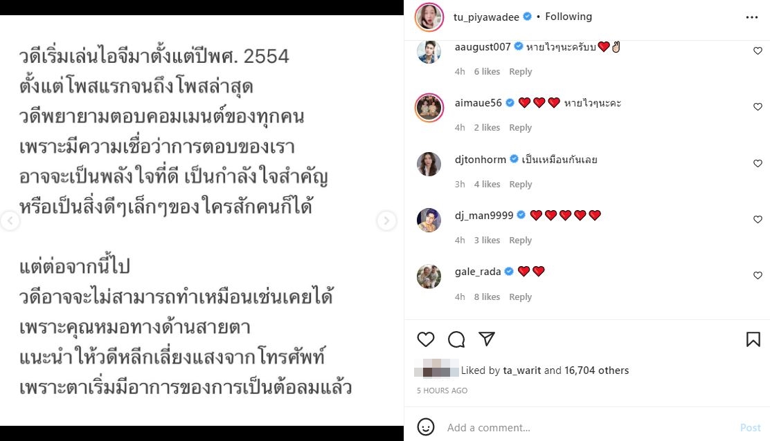 แต่ต่อจากนี้ไปวดีอาจจะไม่สามารถทำเหมือนเช่นเคยได้ เพราะคุณหมอทางด้านสายตา แนะนำให้วดีหลีกเลี่ยงแสงจากโทรศัพท์ เพราะตาเริ่มมีอาการของการเป็นต้อลมแล้ว อย่างไรก็ดีวดีจะยังคงอ่านคอมเมนต์ของทุกคนอยู่เสมอ เพราะการได้อ่านเป็นความสุขประจำวันของวดี วดีขอให้ทุกคนสุขภาพแข็งแรงนะคะ" พร้อมกับเขียนแคปชั่นเอาไว้อีกว่า "ขอขอบคุณทุกๆกำลังใจที่ส่งมาให้กันในโพสนี้ด้วยค่า" โดยมีเหล่าคนบันเทิงได้เข้ามาส่งกำลังใจกันอย่างเนื่องแน่น