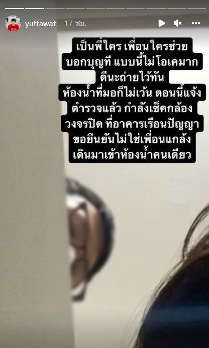 ออกมาโพสต์เตือนภัยทันทีหลังนักแสดงชื่อดังอย่าง "เมฆ ยุทธวัฒน์" เจอเหตุการณ์ไม่คาดฝัน เมื่อมีชายปริศนา ปีนห้องน้ำอีกฝั่ง แอบดู โดยเมฆ ได้โพสต์คลิปเตือนภัยขณะตัดสินใจถ่ายคลิป ซึ่งเห็นคนที่ยื่นหน้าแอบดูตนขณะเข้าห้องน้ำ โดยเมฆได้เผยข้อความว่า เป็นพี่ใครเพื่อนใครช่วยบอกบุญที แบบนี้ไม่โอเคมาก ดีนะถ่ายไว้ทันห้องน้ำที่มอก็ไม่เว้น ตอนนี้แจ้งตำรวจแล้ว กำลังเช็คกลองวงจรปิด ขอยืนยันไม่ใช่เพื่อนแกล้ง เดินมาเข้าห้องน้ำคนเดียว โดยเจ้าตัวได้โพสต์ใบแจ้งความ พร้อมเผยข้อความไว้ในภาพดังกล่าวว่า ถ้าไม่แจ้งความถึงตำรวจ มอก็คงติดแค่ป้ายห้ามทำอนาจาร แบบนี้ต้องเจอของจริง พวกโรคจิต พร้อมอัดคลิปเล่าเหตุการณ์ดังกล่าวอีกครั้งว่า