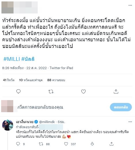 แต่เขาเฮตามมารยาทอะ ชั้นไม่ได้ไม่ชอบมิลลินะแต่ครั้งนี้ชั้นว่าเยอะไป ซึ่งด้านมิลลิเองได้เข้ามาตอบรับกระแสดังกล่าว โดยตอบกลับไปว่า "จริงๆ น้องก็ไม่ได้คิดถึงโปรโมทไรเลยน้า แฮะๆ ติดปั่นอย่างเดียว ขอบคุณสำหรับฟีดแบ็กนะครับ จะเก็บไปพัฒนาฮะ , จะไม่มีใครทัวร์พี่ทั้งนั้น ไม่ต้องกังวลนะฮะ" ซึ่งหลังจากมิลลิได้เข้ามาตอบในโพสต์ดังกล่าว แฟนๆ ก็ร่วมส่งกำลังใจถึงมิลลิ กันเป็นจำนวนมาก