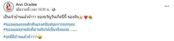 เพิ่งผ่านพ้นวันคล้ายวันเกิดครบ 30 ขวบกันไปหมาด ๆ สำหรับหมอลำสาวยืน 1 อย่าง "แอน อรดี" ทีงานนี้เจ้าตัวถึงกับปลื้มปริ่มหนักมาก เพราะได้ซื้อบ้านใหม่สุดหรู หลังโตที่ จ.ขอนแก่น เป็นของขวัญวันเกิดที่ได้มาจาก น้ำพักน้ำแรงของตัวเอง พร้อมกับโชว์ทะเบียนบ้านเพื่อยืนยันว่าเป็นเจ้าของบ้านแล้ว โดยเจ้าตัวได้ออกมาโพสต์ทาง เฟซบุ๊กส่วนตัวว่า "เป็นเจ้าบ้านแล้วน้าาา ของขวัญวันเกิดปีนี้ ของฉัน #ขอบคุณแรงผลักดันแรงสนับสนุนจากทุกๆคน #ขอบคุณทุกพลังที่สานฝันให้เป็นจริงนะคะ ……. #อรดีมีบ้านแล้วน้าาาา"